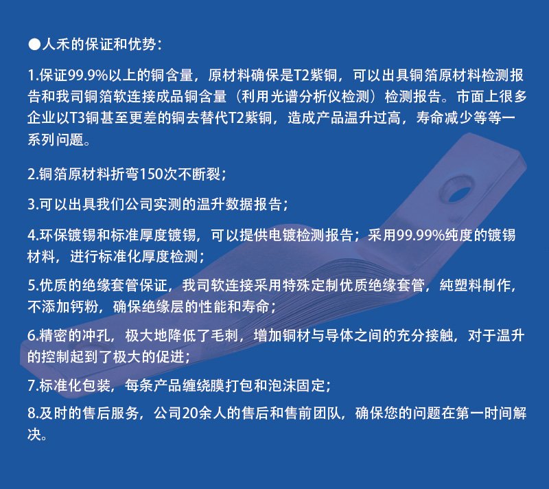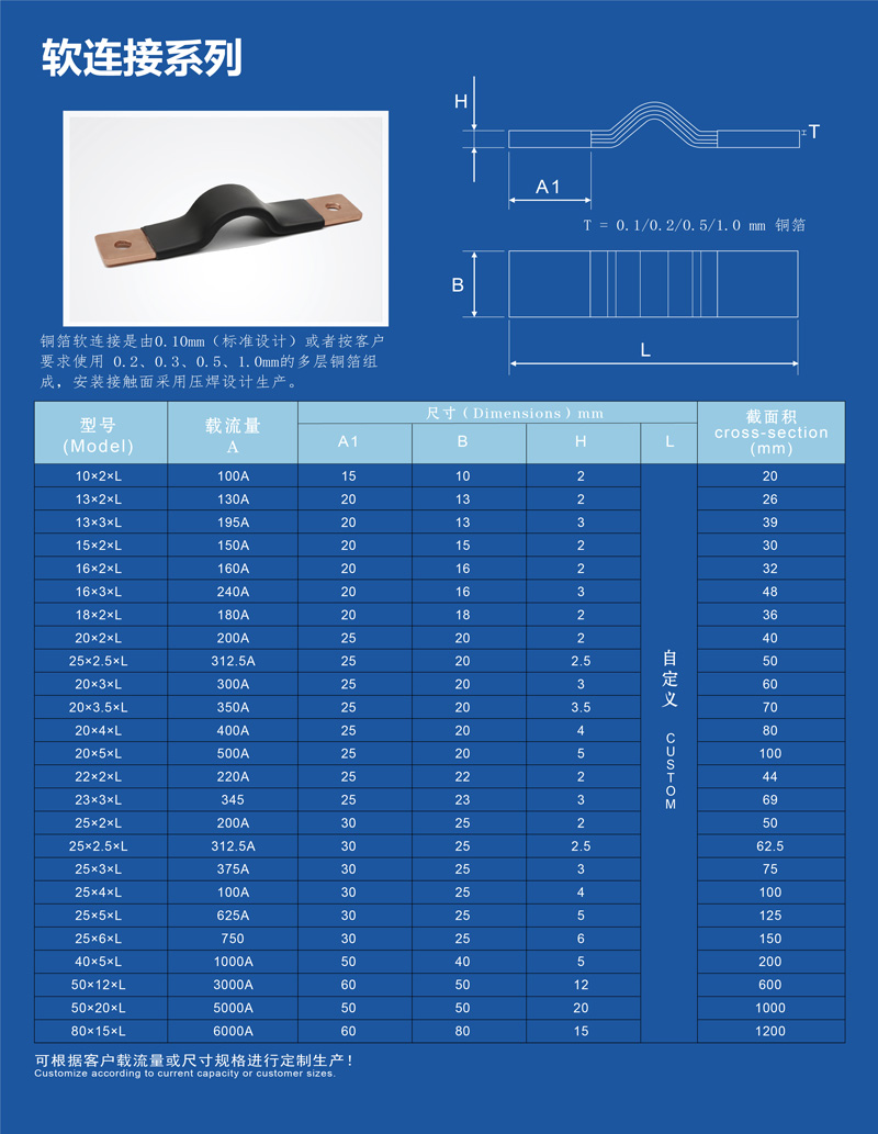 銅排軟連接采用T2無(wú)氧銅箔,經(jīng)分絲處理,通過(guò)高分子擴散焊接,整體或表面可鍍銀或鍍錫。 材質(zhì):T2無(wú)氧銅 鍍層:表面鍍銀或鍍錫 接觸面:長(cháng)度可按安裝要求設計 鉆孔:標準設計無(wú)鉆孔,可按圖紙要求定制 絕緣材料:標準設計無(wú)絕緣材料,可按要求使用PVC絕緣套管并熱縮固定 優(yōu)勢:我們是唯一一家既做軟連接,也做浸塑的企業(yè) 特殊設計:可按圖紙要求定制 尺寸:按圖紙要求定制
